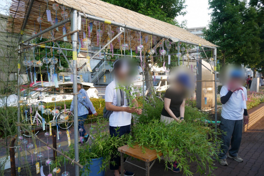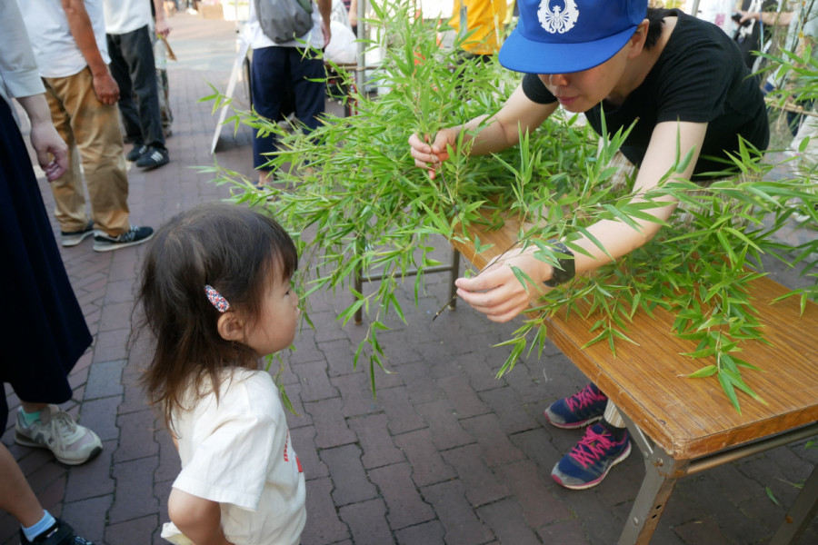 「備前岡山京橋朝市」は平成元年(1989年)、岡山市の市政施行100周年を記念して始まりました。現在は地元の人たちが中心となり運営されています。日本の文化や季節の行事を感じてもらいたいと、運営本部のテント前では毎月旬のものが配布されています。取材に訪れた7月は、笹の葉を来場者に手渡ししていて、風鈴の音色にも癒されました。8月は鈴虫、秋には紅葉、冬は甘酒などを用意するそうです。日本の文化に触れられる場所というのも、京橋朝市の魅力のひとつです。