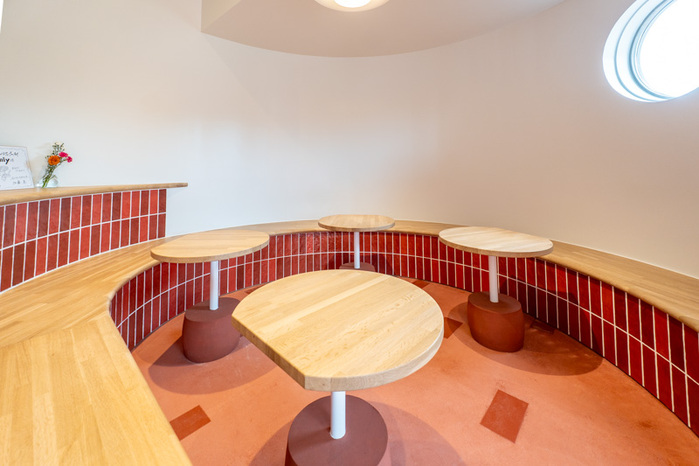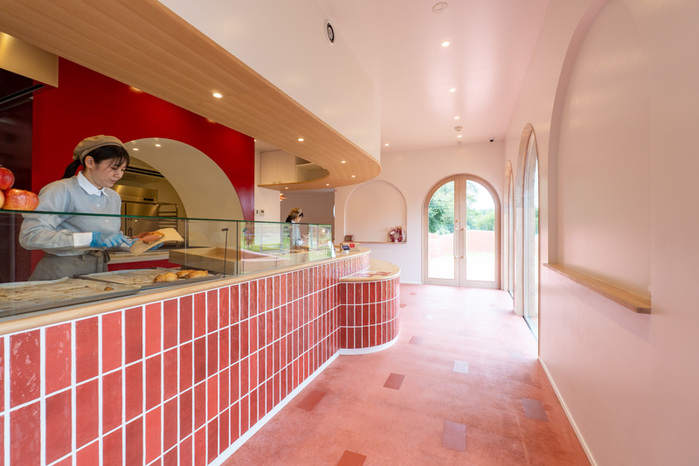 曲線を活かし、柔らかな雰囲気にデザインされた店内は、まあるいりんごをイメージ。