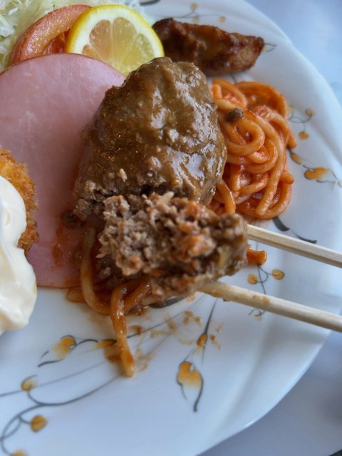 まずはハンバーグ。わりと野菜やパン粉などのつなぎ少なめの肉肉しいハンバーグ。ナツメグもほどこされ、手づくり感あふれる美味しさ。