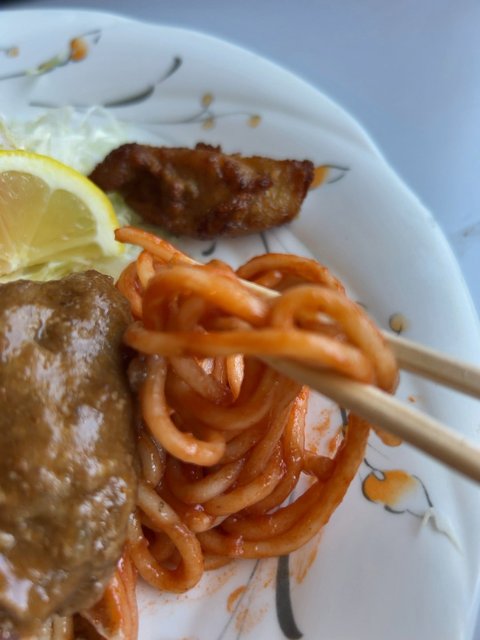 極太さと柔らかさ、そしてケチャップのウェット感がいいスパゲッティ。口のまわりテカテカ、わんぱく気味にいただきます(笑)