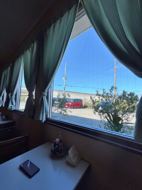 今回はテーブル席に案内されました。カーテンの雰囲気もどこかレトロ(笑)