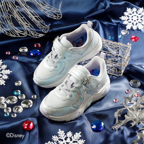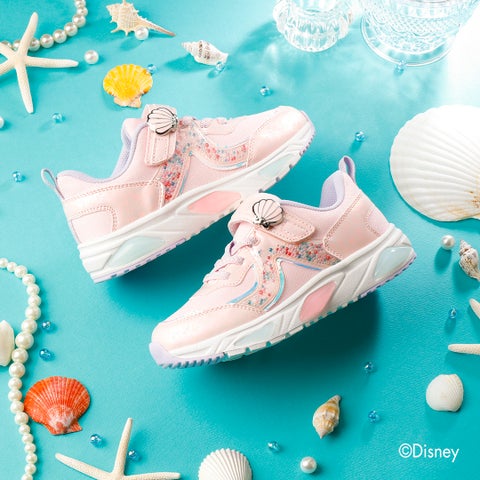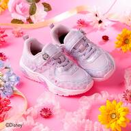 アナと雪の女王、アリエル、ラプンツェルをイメージしたランニングスタイルのスニーカーが登場します。サイドのビーズは歩くたびに揺れるキュートでカラフルなデザインです。ラメ入りのメッシュと靴紐、ミッドソールにはジュエルのようなカラーパーツを搭載し、どこをとってもプリンセス気分を演出します。通園、通学からお出かけまで、様々なシーンで活躍する万能な1足です。