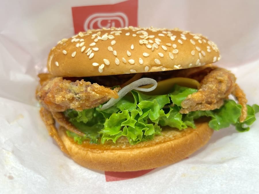 高級食材であるソフトシェルクラブを丸ごと挟んだ衝撃のビジュアルと、柔らかなカニの旨みがたっぷり味わえる美味しさで大人気に。その後、期間限定で再販売を繰り返しています。