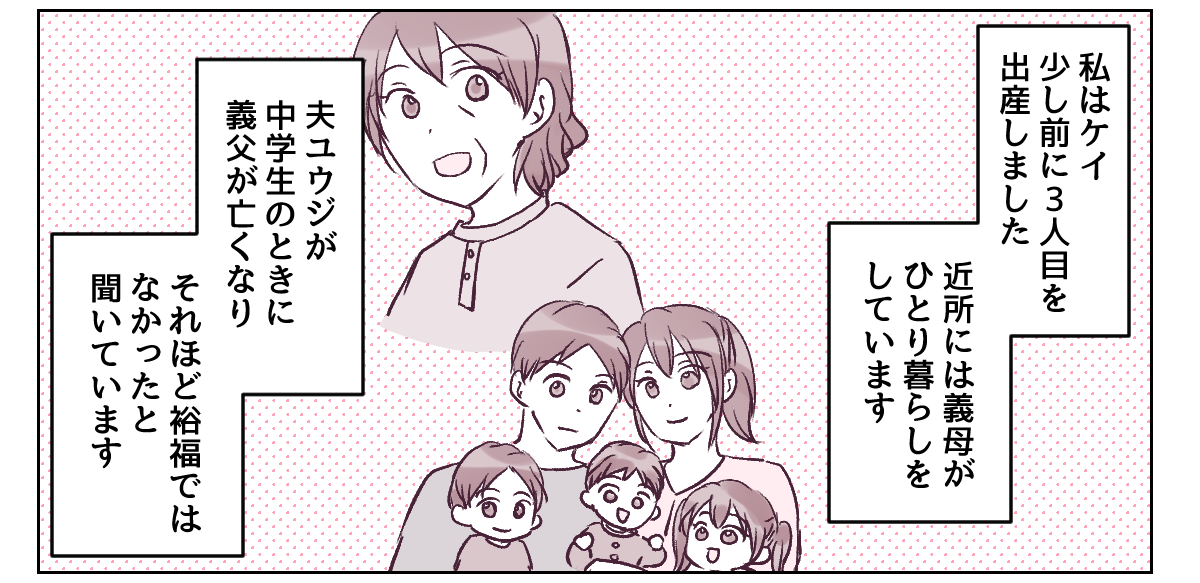 私はケイ。夫ユウジと3人の子どもと暮らしています。いまはユウジのお給料だけでなんとかやりくりしているけれど、赤字ギリギリで節約の日々です。私の実家がなにかとお祝い金を包んでくれて、ベビーグッズも買ってもらったりして助かっています。