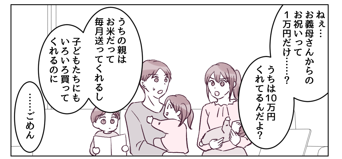 3人目の出産にあたり、私の実家からはお祝いを10万円もらいました。これまでも子どものために必要なものを気前よく買ってくれ、毎月お米など食料品も送ってくれて本当に助かっています。しかし義母からの出産祝いは1万円……。