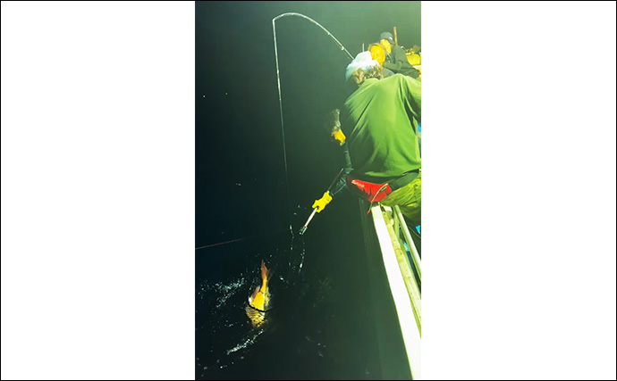 船に乗っているお客さんも集まってきたので、何が何でも釣り上げてほしい。船長が「ステラいい音鳴るね」とタモを持って待機。プレッシャーのなか、何とか中層を越えたころにようやく引きが緩んだ。