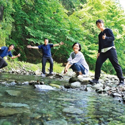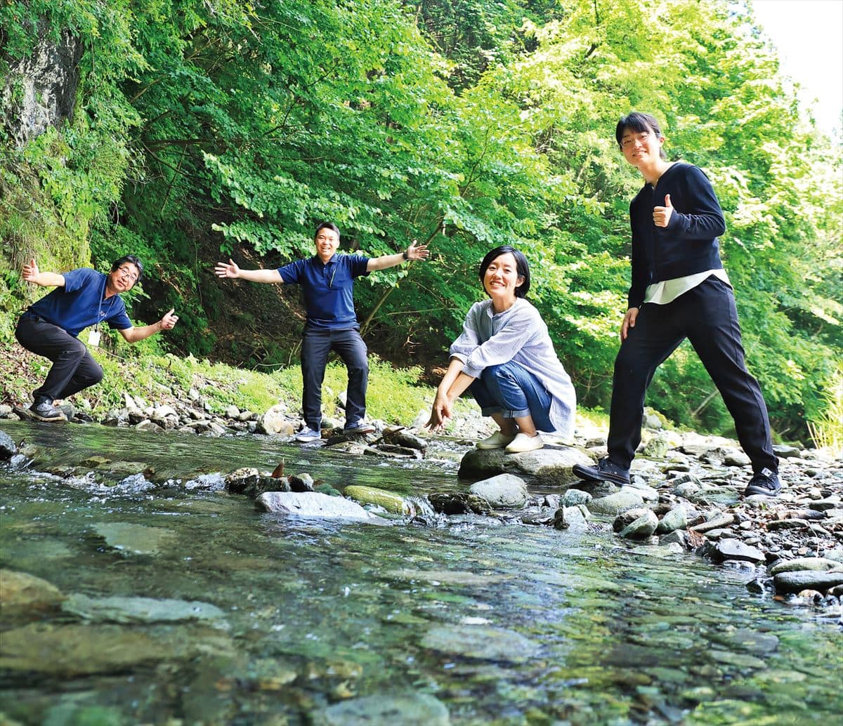 市内を流れる三波川(さんばがわ)は水がきれいで、夏はホタルが楽しめる。右から、森林課の渋木香里さん、鬼石振興課の吉田まり子さん(2025年8月末で任期終了)、森林課の横尾幹さん、鬼石振興課の星野貴男さん。世代が異なる4人だが仲がよく、のびのびと楽しそうに活動している。