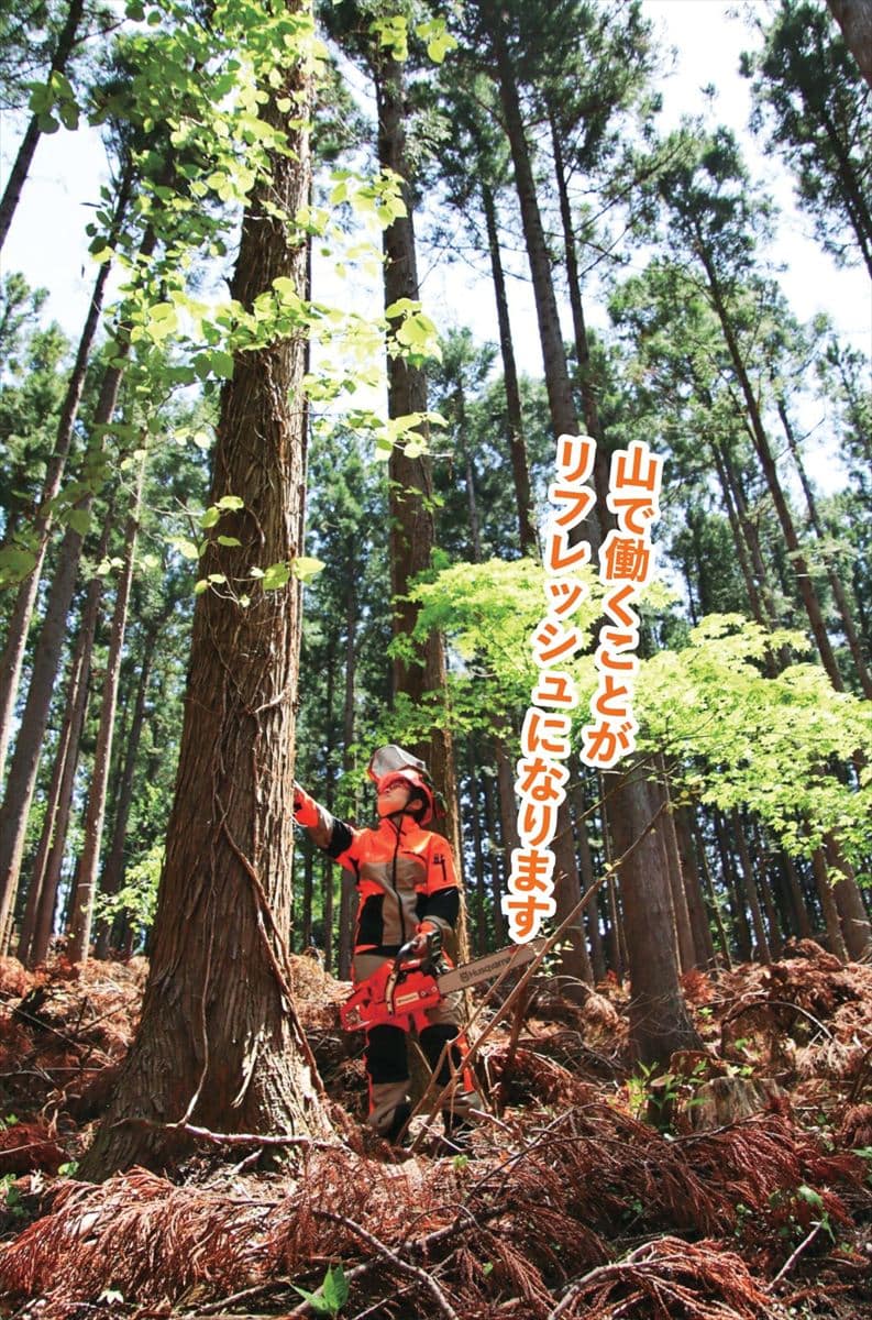 「災害ボランティアをしているなかで、土砂災害の要因のひとつが山林の放置にあると知り、山を整備する仕事に就きたいと思いました。研修が始まったばかりですが、基本的な技術はもとより、林業において必要なさまざまな資格や講習が受けられるのも魅力です」(横尾さん)