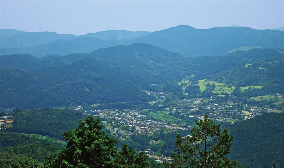 桜山公園から見た鬼石のまちなみ。中央を流れる川の手前が鬼石地域で、奥は埼玉県神川町(かみかわまち)。桜山公園は、国の名勝および天然記念物に指定されている冬桜の名所。秋から春にかけて約7000本の冬桜が楽しめる。