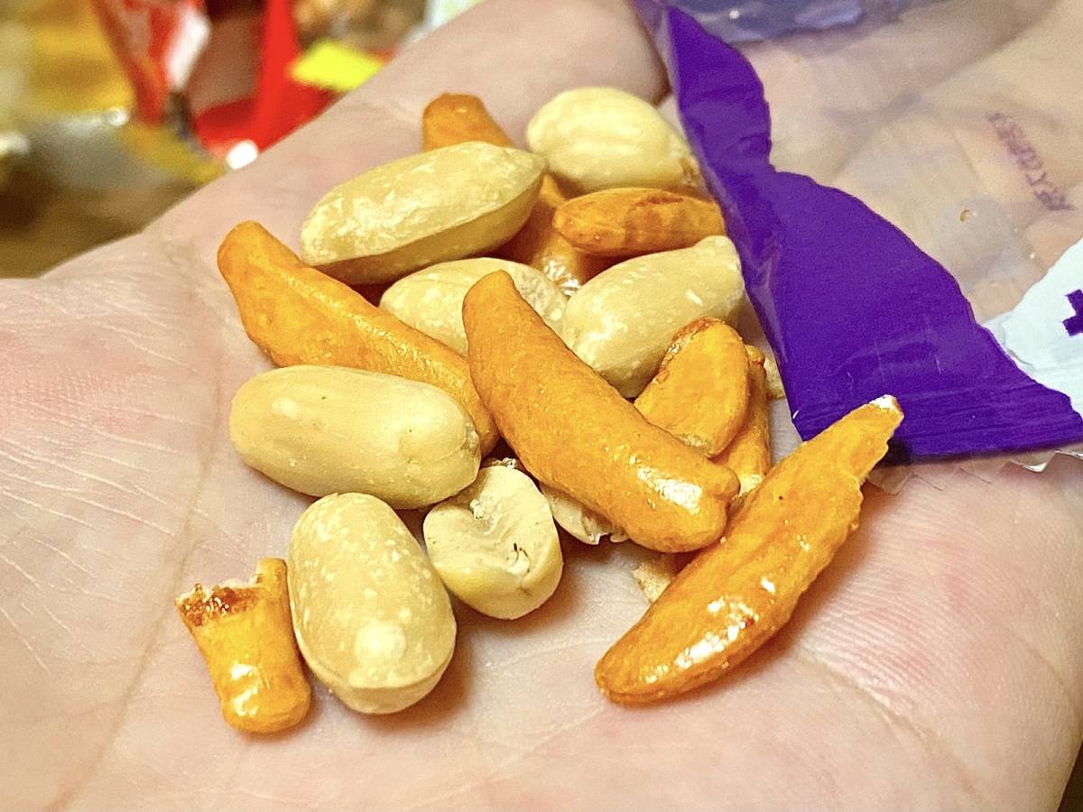 柿ピー・バタピー・ココアピー・ソフトビンズ・スパイシーソイビンズの5種類の豆菓子。
