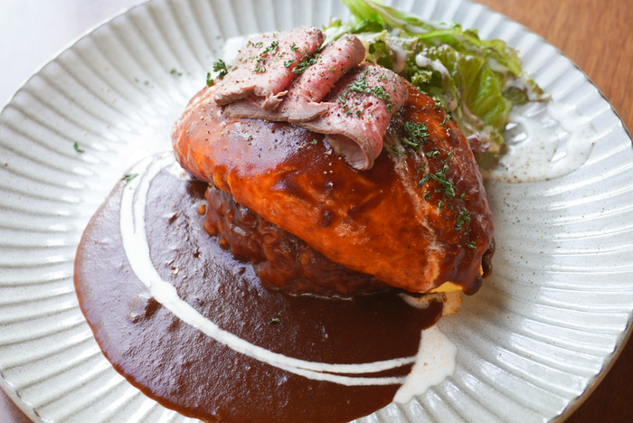 スッと切れ目を入れるとブワ〜ッとほどけていくとろとろの卵と、和のエッセンスを隠し味にした特製デミグラスソースをたっぷり絡めて、ぜひ豪快に堪能して♡