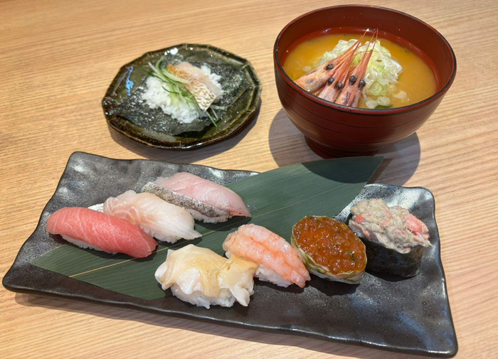 「本まぐろとろ」や「生甘海老」、地物ネタの入ったお寿司7貫に、名物のど黒手巻き、そして汁物がついた超贅沢メニューです♪