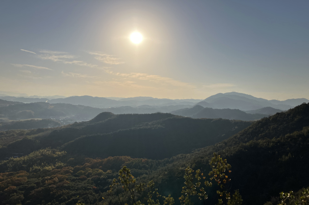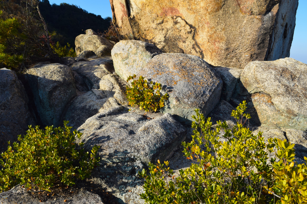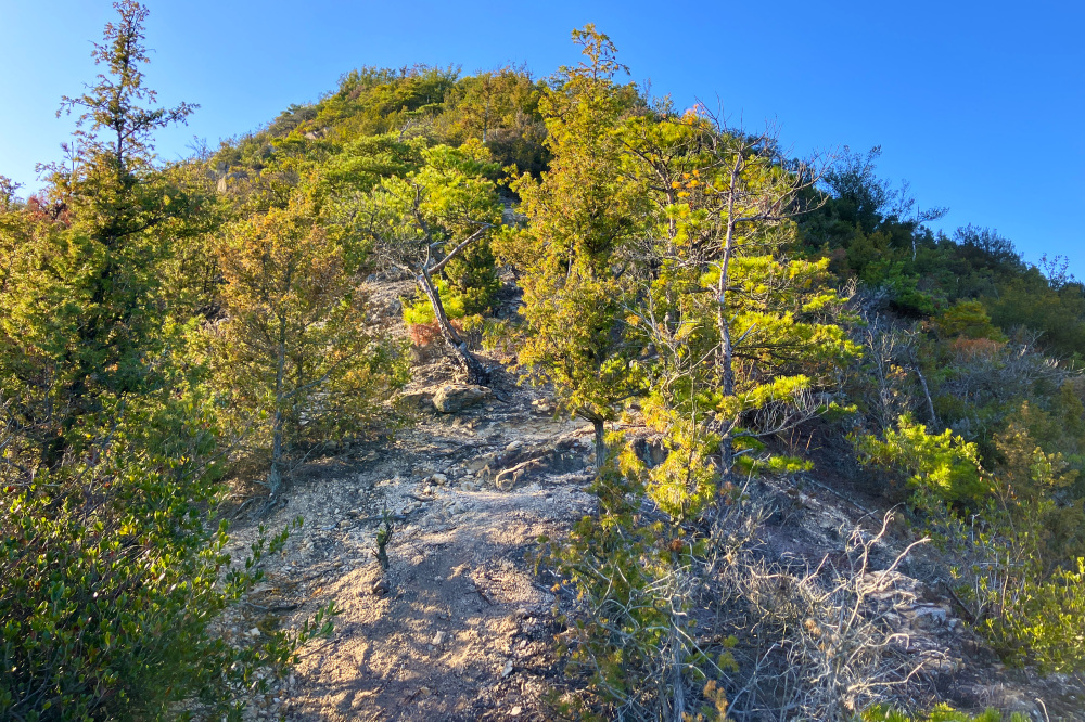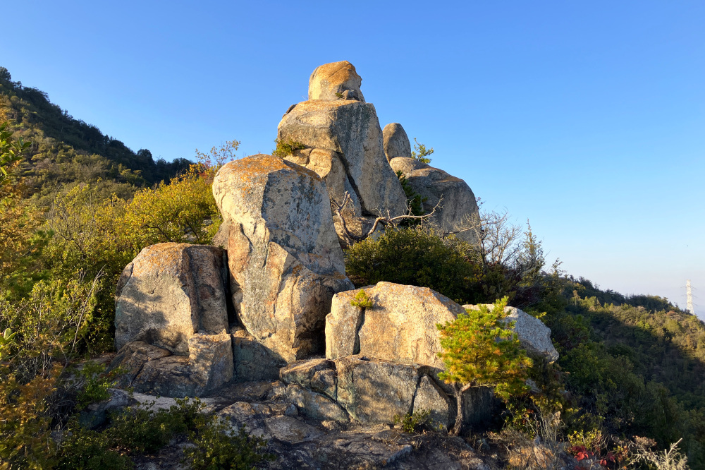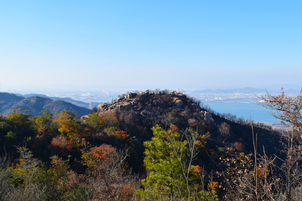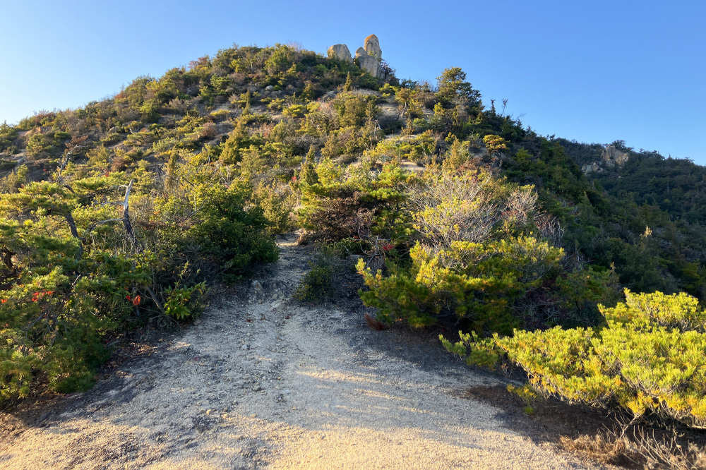 もう少し登って「八丈岩山」の頂上付近まで来てみました。「八丈岩山」から先にも登山道は続いているので、本来は「三頂山」や「貝殻山」(ともに岡山市南区)にもつながっています。しかし、2025年3月に発生した大規模な山林火災によって登山道の一部が損傷しており、現在は岡山市南区方面からの立ち入りは規制されていますので、くれぐれもお気をつけください。