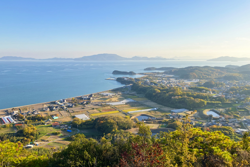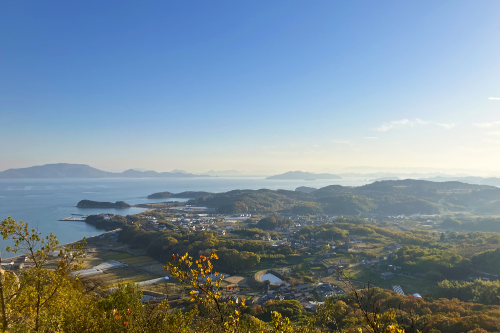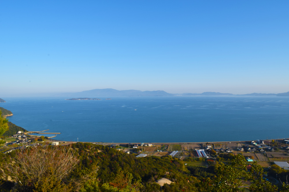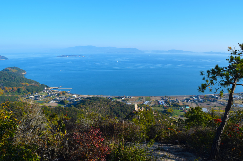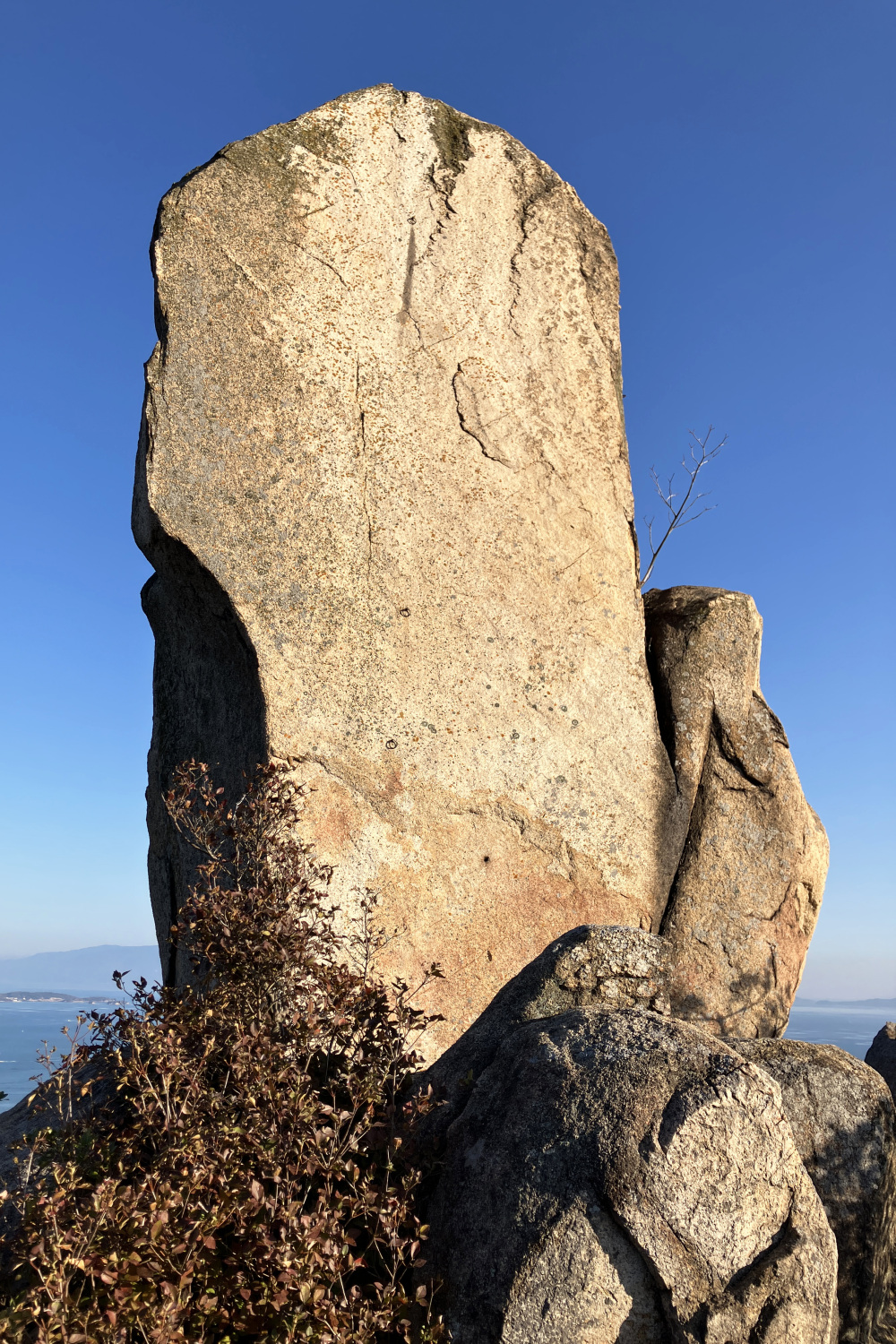 「番田の立石」からは瀬戸内海の絶景が望めます。左手に小さく見えているのは犬島で、その後方に広がる山並みは小豆島です。フェリーや貨物船などが頻繁に通過していくのが間近に見え、瀬戸内海を往き来する船からも「立石」を容易に視認できることが想像できます。