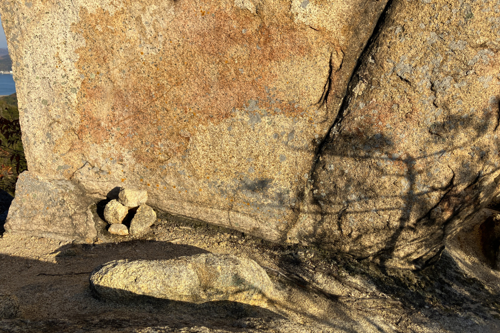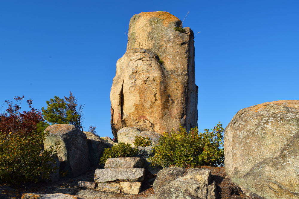 古代の技術でも、水運を利用したり、コロ、テコ、滑車などの道具を駆使すれば巨石を運んだり積んだりすることは可能です。しかし、この場所は周囲から屹立した狭い山の頂上なので、大きな岩を移動させることはもちろん、起立させる作業ですら困難ではないかと感じます。だとすれば、やはり自然にできたものなのでしょうか…。