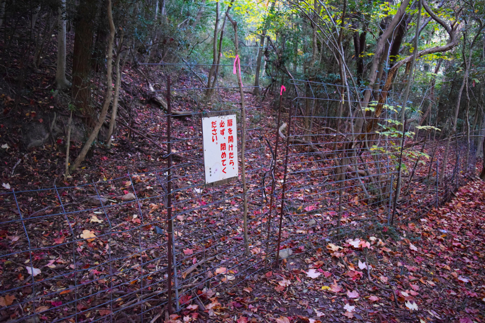 「番田の立石」の南側の山麓に「新池」(グーグルマップでは摺針池と表示される)という溜池があり、その北東あたりに位置する農道を山裾へ向かって進むとイノシシ対策の防護柵が見えてきます。柵に沿って歩くと開閉できる扉がありますので、これを開けて中へ入り扉をもと通りに閉めます。そこから先は樹木に付けられた赤や黄色の目印を頼りに雑木林の山道を進みます。