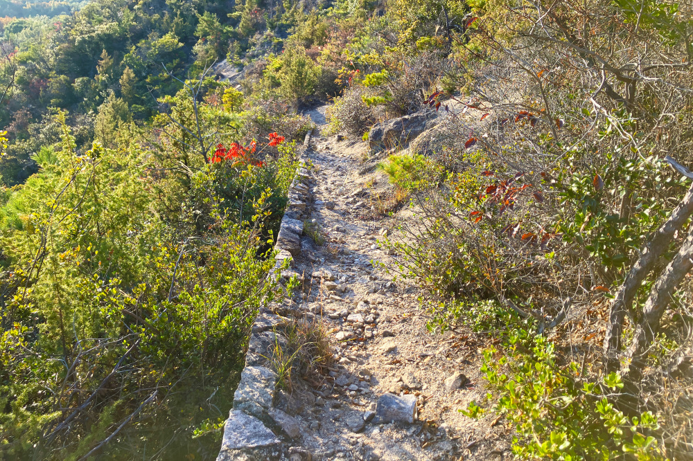 正しいルートを見つけて無事に林を抜けると、このように石で補強されたつづら折りの坂道にたどり着きます。見た目はキツそうに見えますが、歩きにくいながらも勾配はそれほどでもなく、このあとは一本道なので迷う心配もありません。