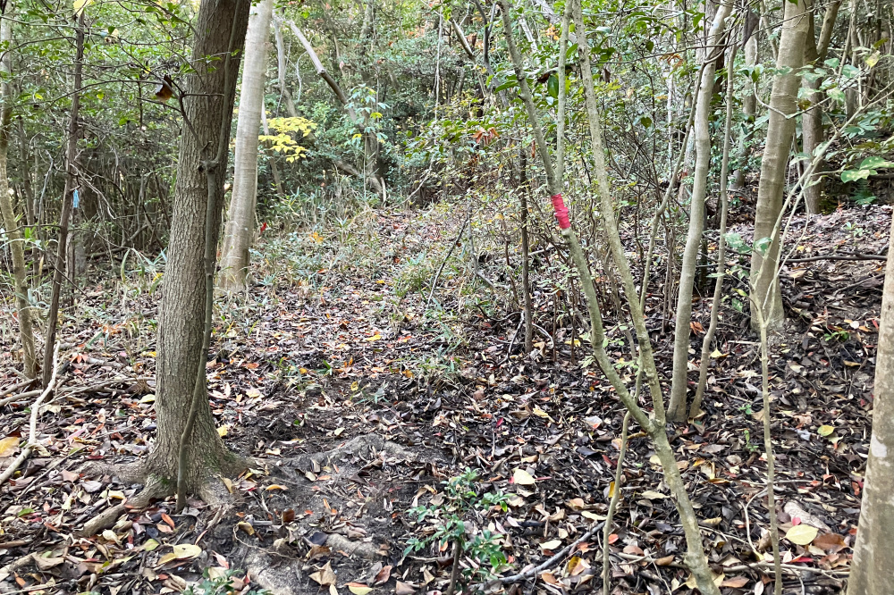 地面には道らしい痕跡がほとんどないので、樹木の目印だけが頼りです。これを見失うと進むべき方向がまったくわからなくなります。さらに、直接「立石」へ向かうルートと大きく迂回するルートの2通りあるので、その目印がどちらを指し示しているのかを見極めることが必要となります。ある意味、今回の行程のなかで難易度が最も高いのはこの雑木林のセクションかもしれません。