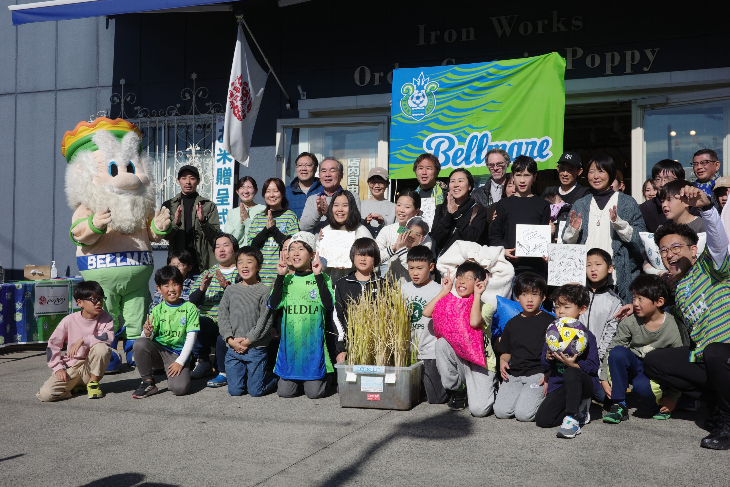 午前10時、室さんの開会の挨拶とともにベルマーレのマスコット・キングベル一世も登場し、お米の贈呈式がスタート。参加者一組ずつに新米が詰まった袋を手渡しながら記念撮影が進んでいきます。