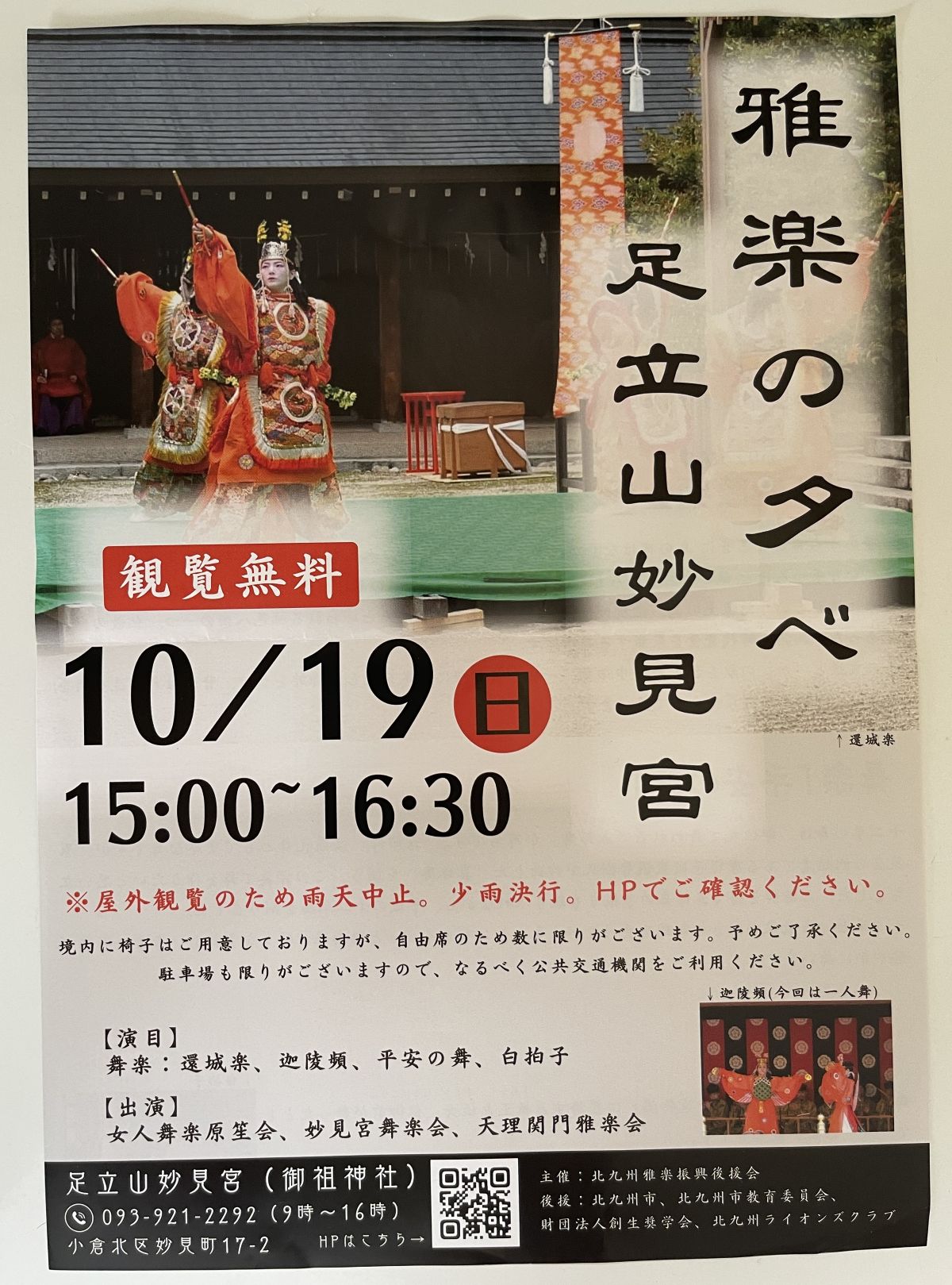 足立山妙見宮・神楽殿(北九州市小倉北区妙見町17-1)で10月19日、雅楽の管弦や舞楽の演奏会「雅楽の夕べ」が開催されます。