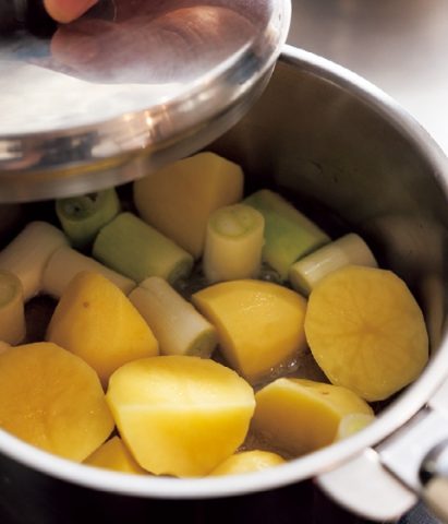電子レンジにかける方法もあるが、蒸し煮にしたほうが、よりホクホクとしておいしい。
