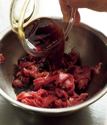 2 牛肉は大きければ食べやすく切る。ボウルに入れてAの砂糖をもみ込み、残りの調味料を加えてからめる(写真1)。