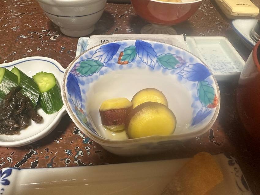 さつまいものレモン煮と漬物です。ホックリとした甘みのさつまいもとレモンの爽やかさがよく合います。浸かり具合の丁度良いキュウリの漬物はご飯のお供にもお茶請けにもどちらにも合いそうです。