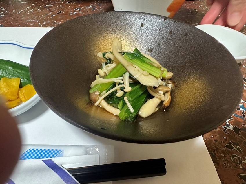 きのこと小松菜の煮びたし。小松菜ときのこの香りをだしがつなげています。
