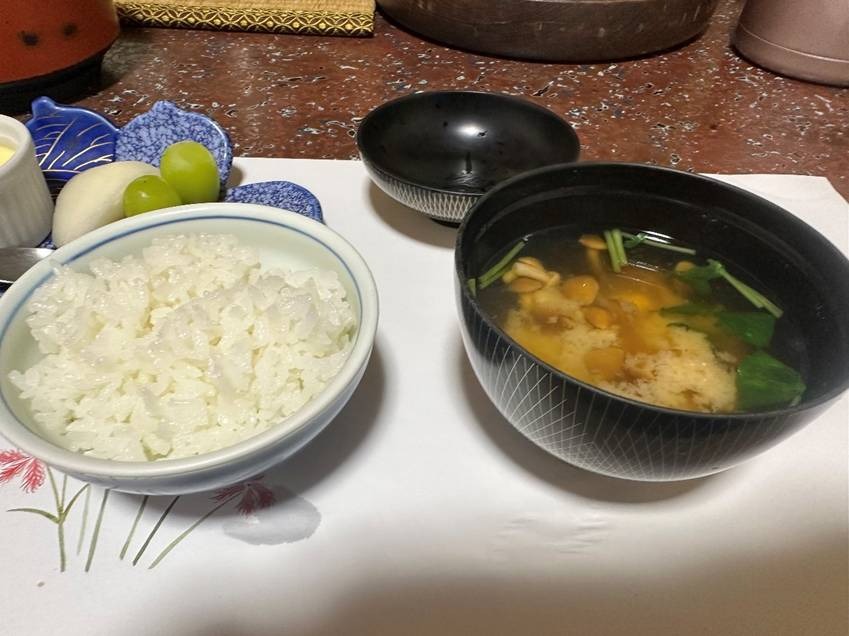 ご飯とみそ汁です。飯坂町の契約農家さんから仕入れているコシヒカリのご飯はふっくらとした炊きあがりで粒が立っていて噛むほどに甘みがジワリと広がります。だしのきいたみそ汁はなめこに三つ葉です。みそとだしのコクと香りが合わさった深みのある味です。