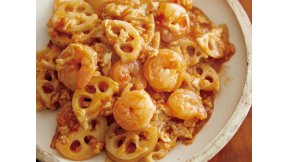 2. フライパンに【A】を混ぜ合わせて中火にかけ、沸騰したらえびとれんこんを加えて底から混ぜながら煮る。再び沸騰してから3分間ほど、しっかりととろみがついてえびに火が通るまで煮る。
