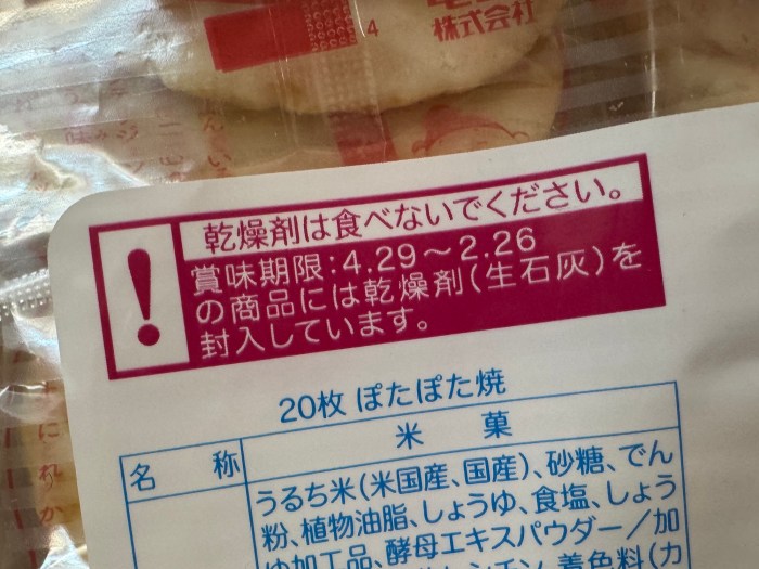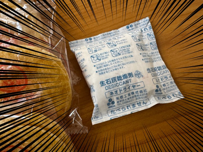 新ぽたぽた焼には「賞味期限:2026.3.21」と記載されていた。再び亀田製菓に問い合わせたところ、この時期は空気が乾燥しているため乾燥剤の封入がない、とのことだ。ちっとも知らなかった……!