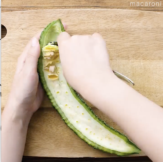 1: ゴーヤのワタを取り除き、縦半分に切って、5mm幅のいちょう切りにします。