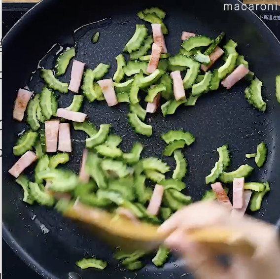 2: フライパンにベーコンを入れて熱し、脂が出たらゴーヤを加えてしんなりするまで炒めます。
