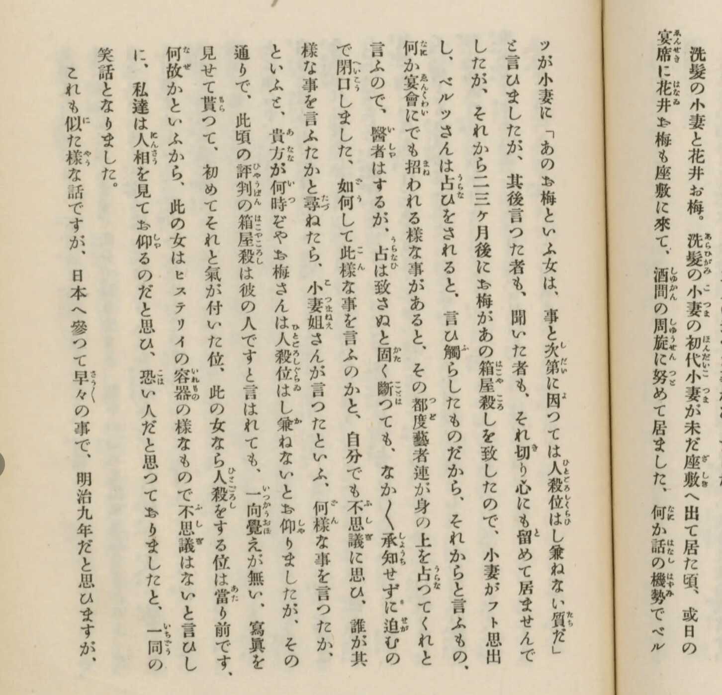夫人であるベルツ花子の著書『欧洲大戦当時の独逸』によれば、ベルツは座敷でお梅を見た際に「あのお梅という女は、事と次第によっては人殺しもしかねない質だ」と語っていたといいます。
