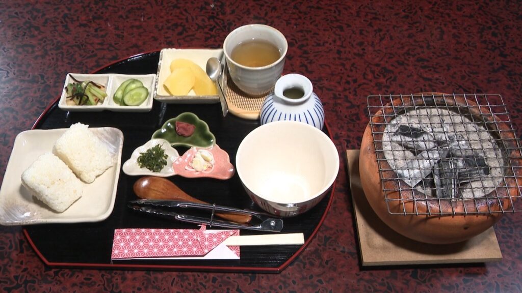 運ばれてきたのは、おにぎりセット。そこに火鉢がついてきます。自分自身で焼きおにぎりを作って、味わうスタイルなんです。