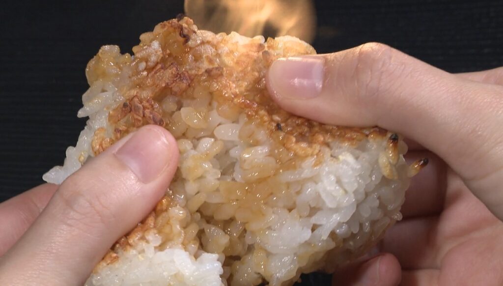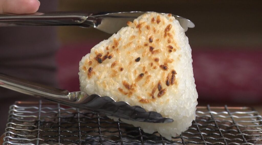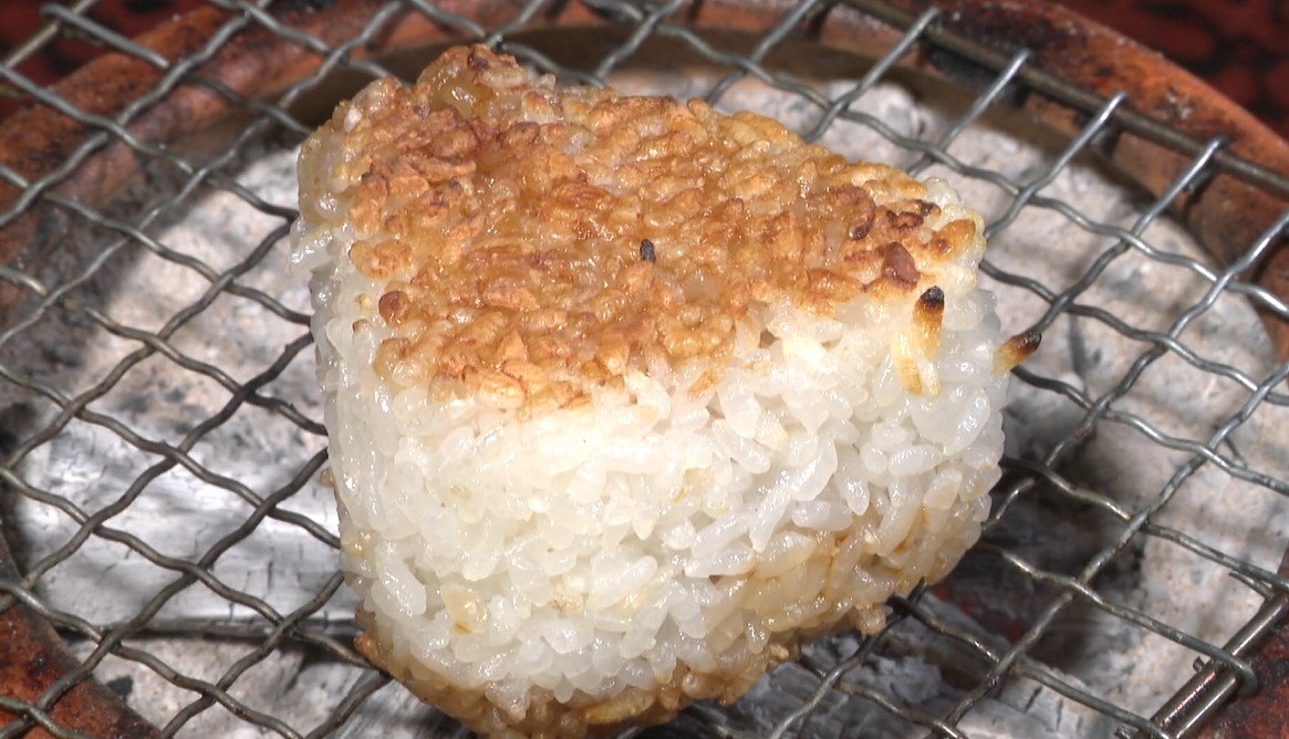 炭火で焼いて、おこげをつくり、しょう油を塗っていきます。両面を焼けば出来上がり。外側はカリっと、中のお米はふっくら。新米の甘味が感じられる、完璧な焼きおにぎりになりました!