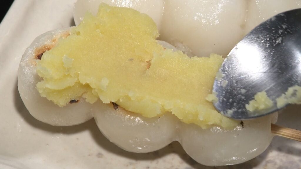 団子にのせる「あん」は5種類の中から選ぶことができます。この日はサツマイモのあんをチョイス。外側はパリッ、中はもっちりとした団子。甘いサツマイモのあんとの相性な抜群でした。