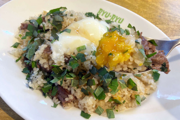 さらに同店では「バターライス」も人気。一人ひとつパスタを注文し、バターライスを分けて食べられるという方も多いのだとか。こちらもおすすめだという「牛肉としそのバターライス 半熟玉子のせ」をいただくことに。