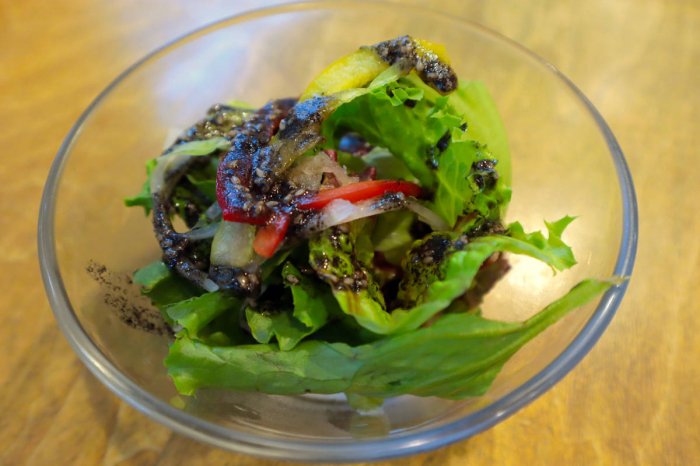 またサラダにも秘密が。こちらの「黒ゴマドレッシング」がかなり人気で、ドレッシングのみを購入される方も多いのだそう。黒ゴマの香り高さが濃厚なのにさっぱりとした味わいで、人気が高いのもうなずけます。