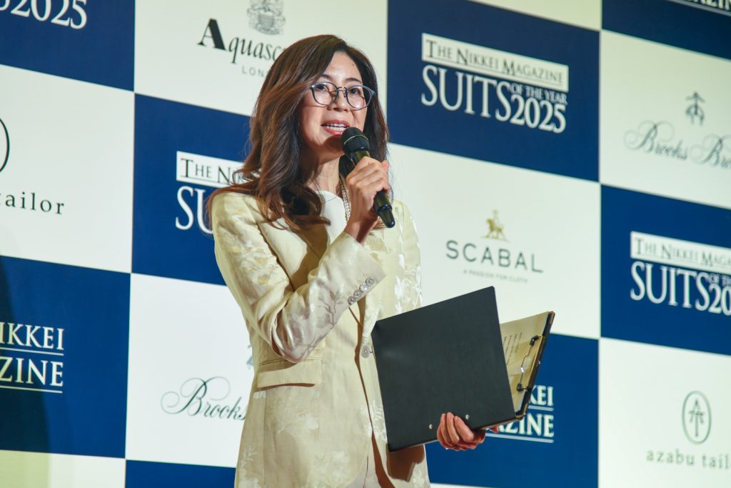今年のテーマである「サステナブル」について「今だけ自分だけという独りよがりや目先の利益に追う風潮に流されず、普遍的な価値を磨いていく努力の積み重ねが、サステナブルな社会を育んでいくはずです」としつつ、「今回受賞された皆さんは日本ならではの時代を越える価値を磨き、それを未来に繋ぐ伝道師として活動されていらっしゃいます。そして身に付けたスーツも普遍的な輝きを放っていますので、どうか最後までお楽しみください」と述べた。