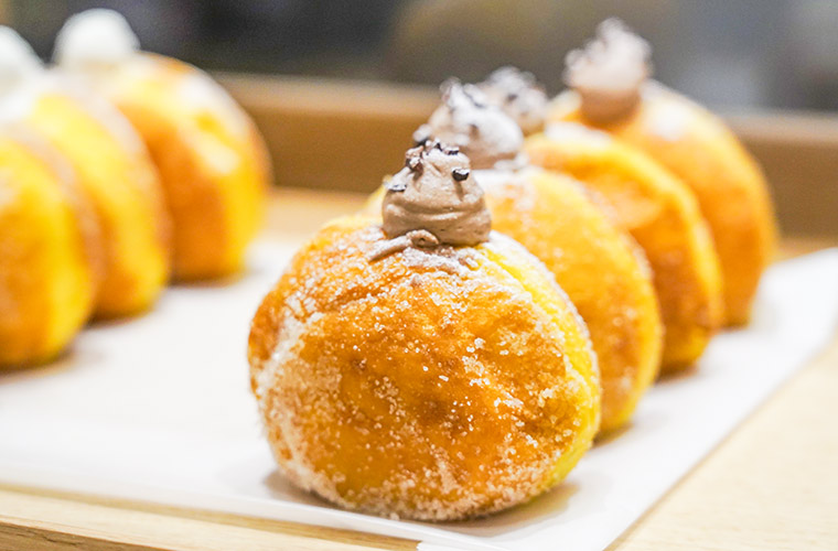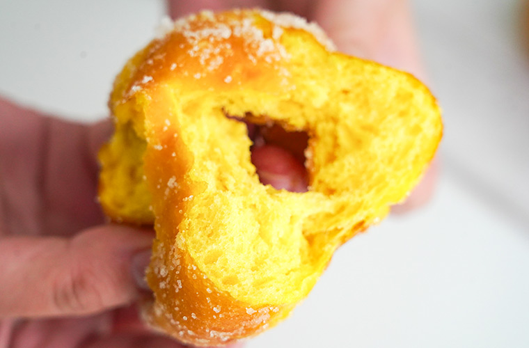 「UNI DONUTS」のドーナツ生地の最大の特徴は、生地に“カボチャ”を使用していること。本来は大きさや味の理由から廃棄されてしまう「規格外かぼちゃ」を生地に練り込み、しっとりとした口当たりを実現しています。さらに、独自の配合と発酵によって、ふんわり軽く、とろけるような食感に仕上げました。