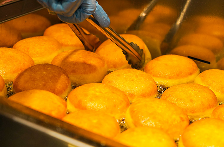 自慢のドーナツは、店内でじっくり発酵させ、一つひとつスタッフの手作業で丁寧に揚げています。店頭に並んだそばからどんどん売れていき、時間によって売り切れてしまうので、フルラインアップを楽しみたいなら、開店直後の来店がおすすめです。