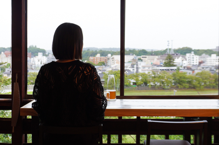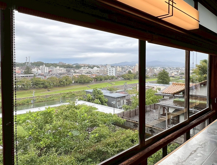 「かに粥」をいただくのは、犀川越しの戸室山という金沢らしい絶景が広がる大広間。今では大変希少な大正ガラス越しにみえる景色はなんとも風情があります。