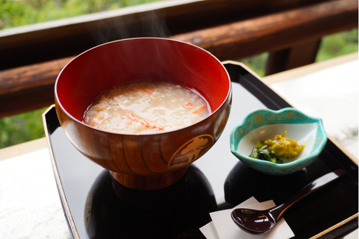 漆塗りの美しい器で提供されるかに粥。レシピは、つば甚の料理人に古くから脈々と受け継がれているものなのだそう。器も古くから愛用されている貴重な品。