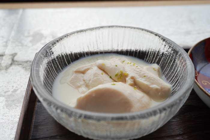 ほんのり温かな自家製くずし豆腐。そのままでも大豆の旨みが十分に感じられ美味しいのですが、塩麹を加えるとさらに甘味が増して絶品でした。