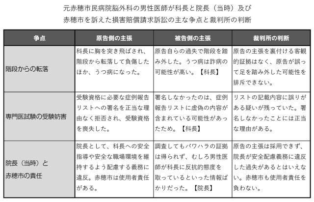 判決で池上尚子裁判長は、「(上司の科長から)故意に階段から突き落とされ、うつ病に罹患するほど精神的苦痛を被った」などとする男性医師の主張を「原告が誤って足を踏み外した結果、生じた可能性を排斥できない」として退けた。また、血管内治療専門医試験の申し込みに必要な症例報告リストに科長が署名せず、「受験を妨害された」との訴えについては、「リストの記載内容に誤りがある疑いが残っていた」とし、署名しなかった科長の正当性を認定。その上で、院長の過失や赤穂市の使用者責任を否定した。