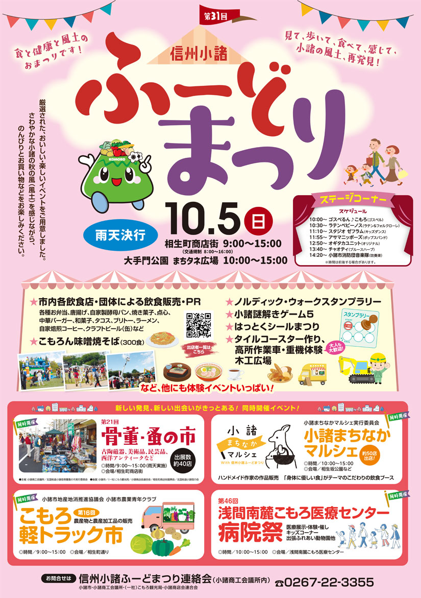 今年も、各エリアにご当地グルメのこもろん味噌焼そばをはじめとするさまざまな飲食店やキッチンカーなどが並ぶほか、謎解きゲーム、スタンプラリーなど様々な体験、ステージイベントなどが繰り広げられます。さらに同エリアでは、『第21回骨董・蚤の市』『第16回こもろ軽トラック市』『小諸まちなかマルシェ』『第46回浅間南麓こもろ医療センター病院祭』も同時開催されます。