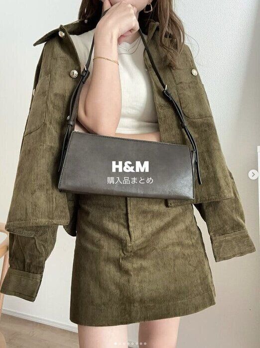 aiさんは、H&Мにて「オーバーサイズジャケット(5,499円)」と「ミニスカート(2,999円)」を購入。セットアップ風のコーデがとてもおしゃれで、コーデュロイ素材が秋らしいのも素敵ですよね。色合いが絶妙で、キレイめにもカジュアルにも使えそう。とってもお似合いですよね♪