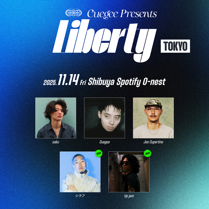 そんな松村和哉がソロ名義Cuegeeとして11月14日(金)Spotify O-nest、11月23日(日)梅田Shangri-Laにて開催する初主催イベント「Liberty」に、シラフ・tip jam(東京)、KennyDoes(梅田サイファー)(大阪)の出演が決定した。既に東京公演ではJoe Cupertino・saku、大阪公演ではEASTA・Kay-onの出演が発表されており、名だたるラッパーが揃ったイベントとなっている。Cuegeeが次作EPのタイトルとして示した通り、溜め込んだ才能が解き放たれるこのイベントは、Cuegeeが描きたかった物語を肌で体験できる夜になるに違いない。