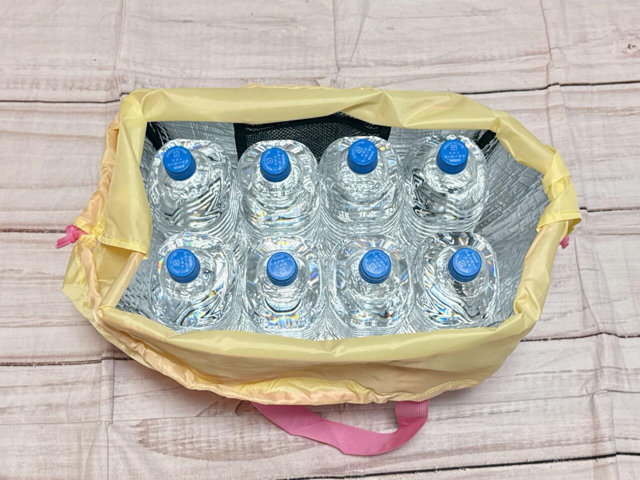 横マチ、底マチがたっぷりあるので、大容量!なんと2Lペットボトルが8本収納できちゃいました♪